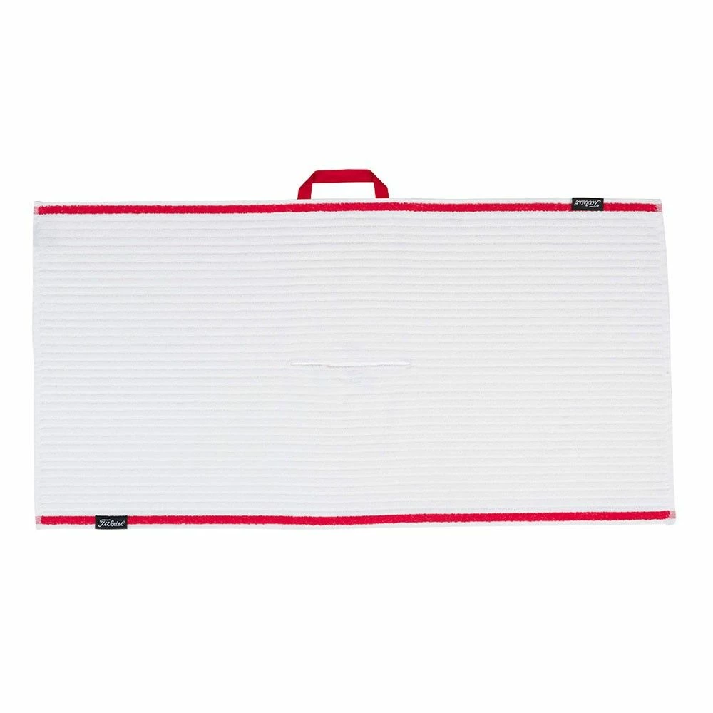 Titleist’s new Tour Staff Towel is made from 100% maximum absorption terry material. The new functional design enables the towel to be fully absorbent making cleaning and drying of clubs are much easier. The towel incorporates a centre slit which allows it to fit over any club head. This towel is considerably larger than other towels in the Titleist towel range at 50cm x 100cm. The Titleist Tour Staff Towel is now white with red piping along its outer edge, incorporating a new, subtle woven Titleist logo label on the bottom of the towel.
